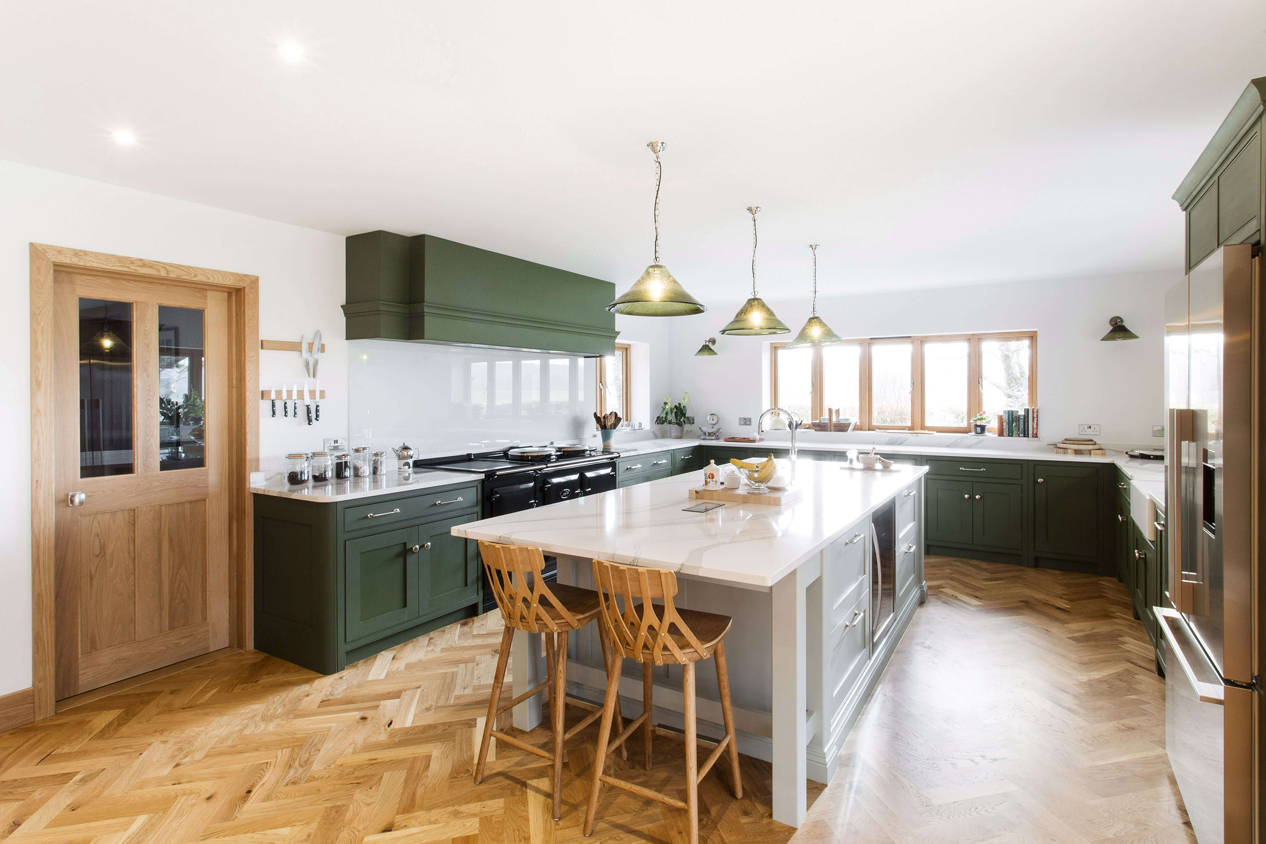 Franke双层贝尔法斯特(Belfast)水槽位于江南娱乐平台下窗户下方,是所有乡村厨房的主食,搭配经典的Perrin & Rowe搅拌机龙头;可以看到房子周围的农田和田野的美丽景色。