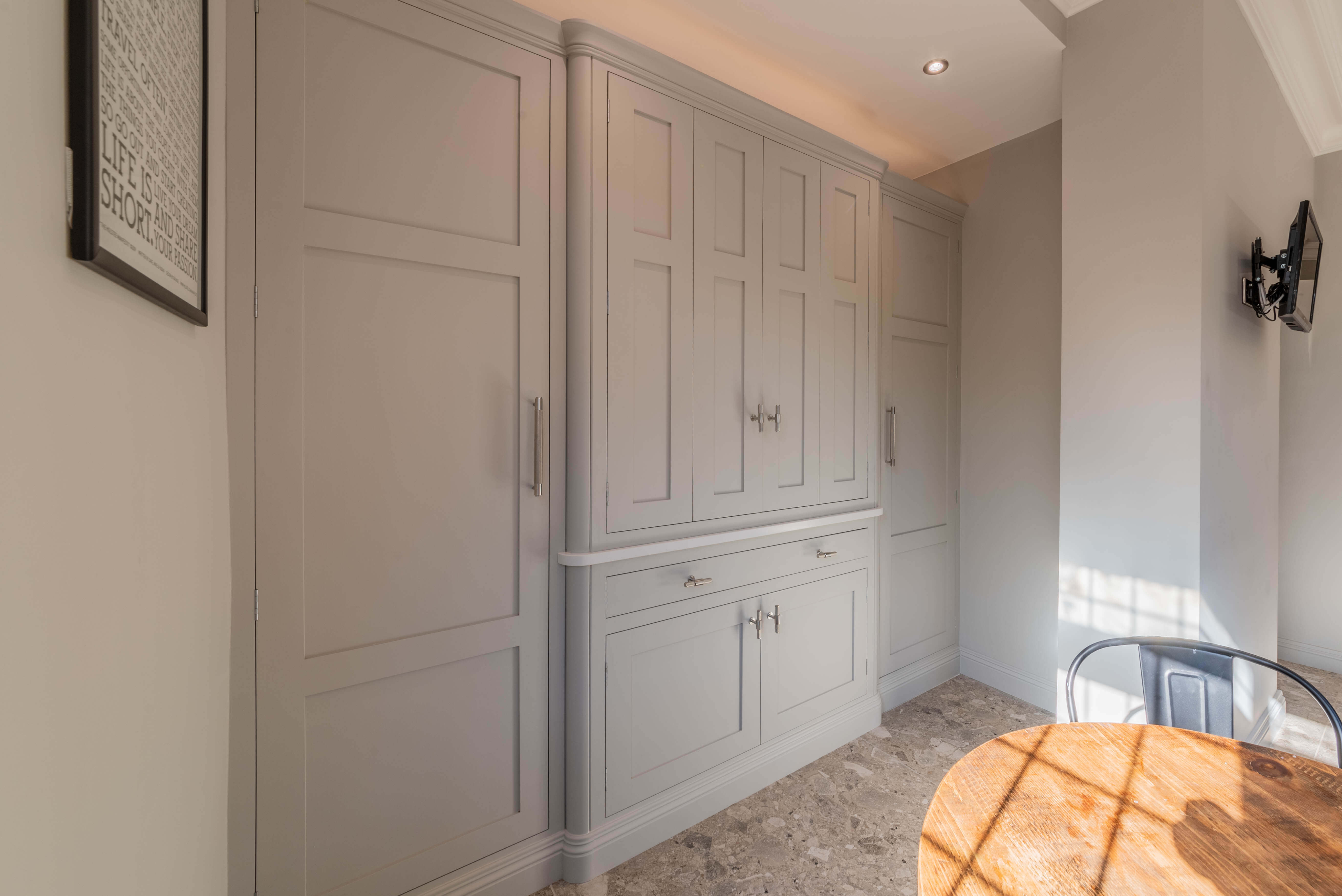 我们在切姆斯福德(Chelmsford)的设计师将房主的厨房改造成了一个完美的三角形厨房,烤箱、水槽和冰箱相距仅几英尺,包括一个相当大的工作台面,用于准备食物。