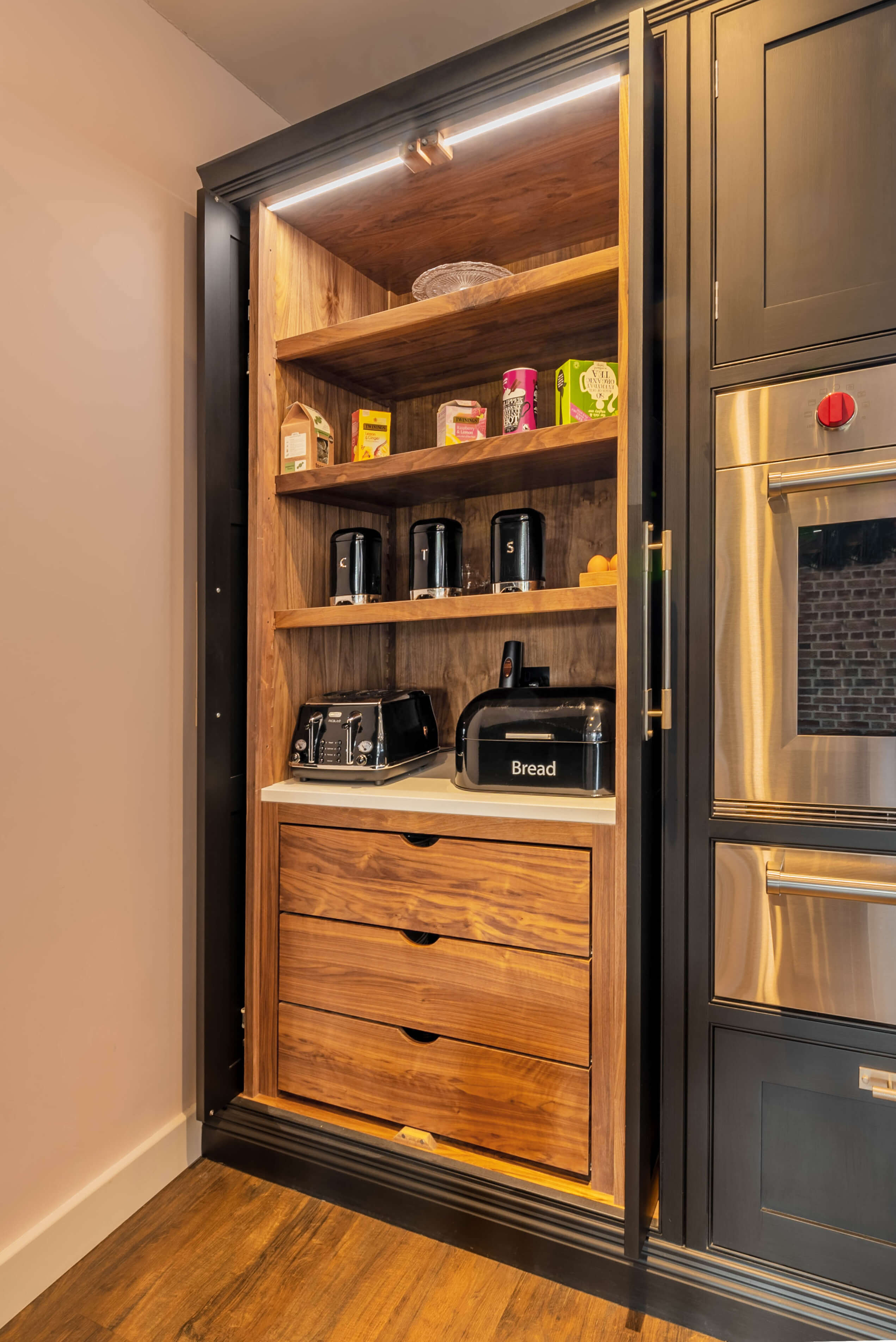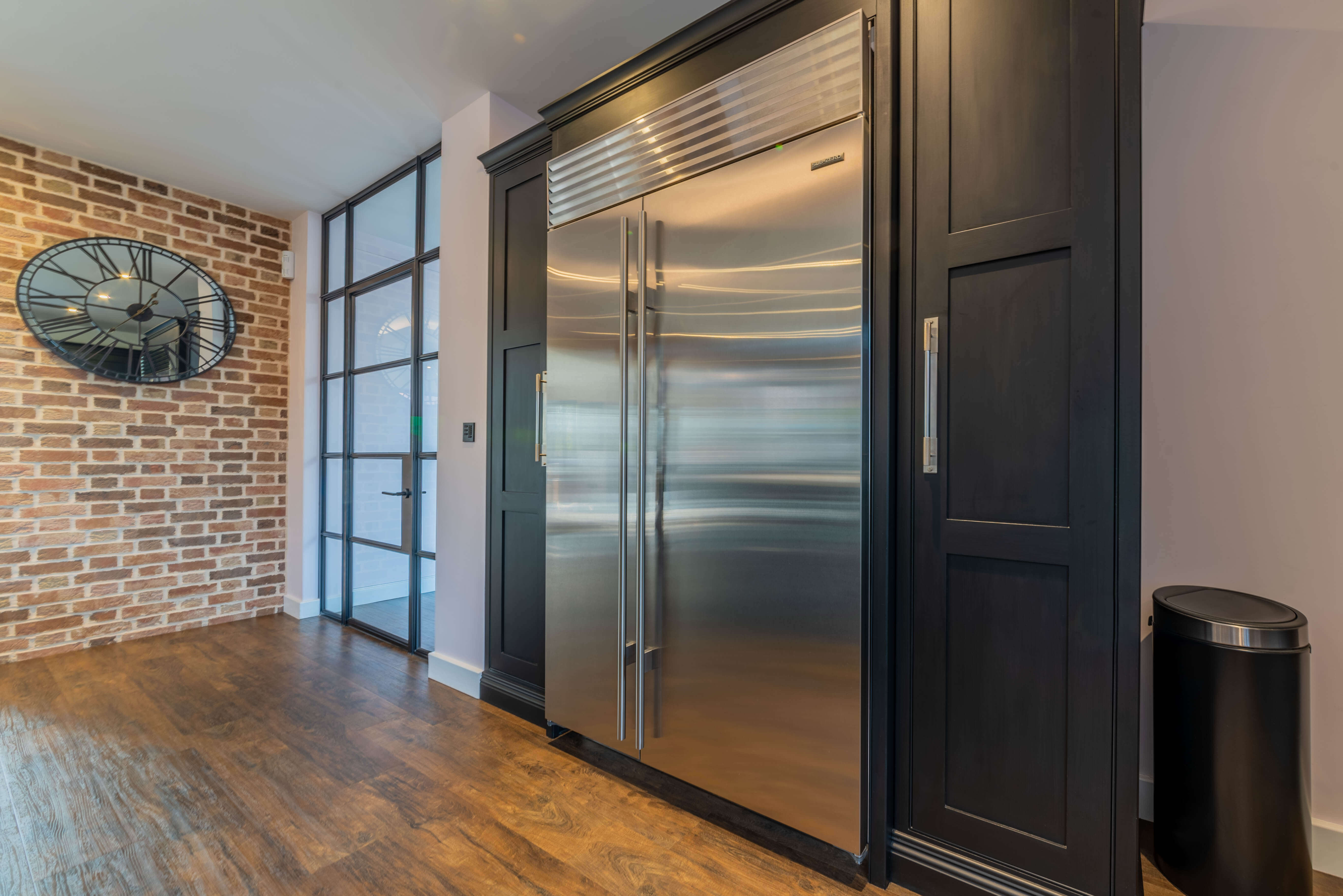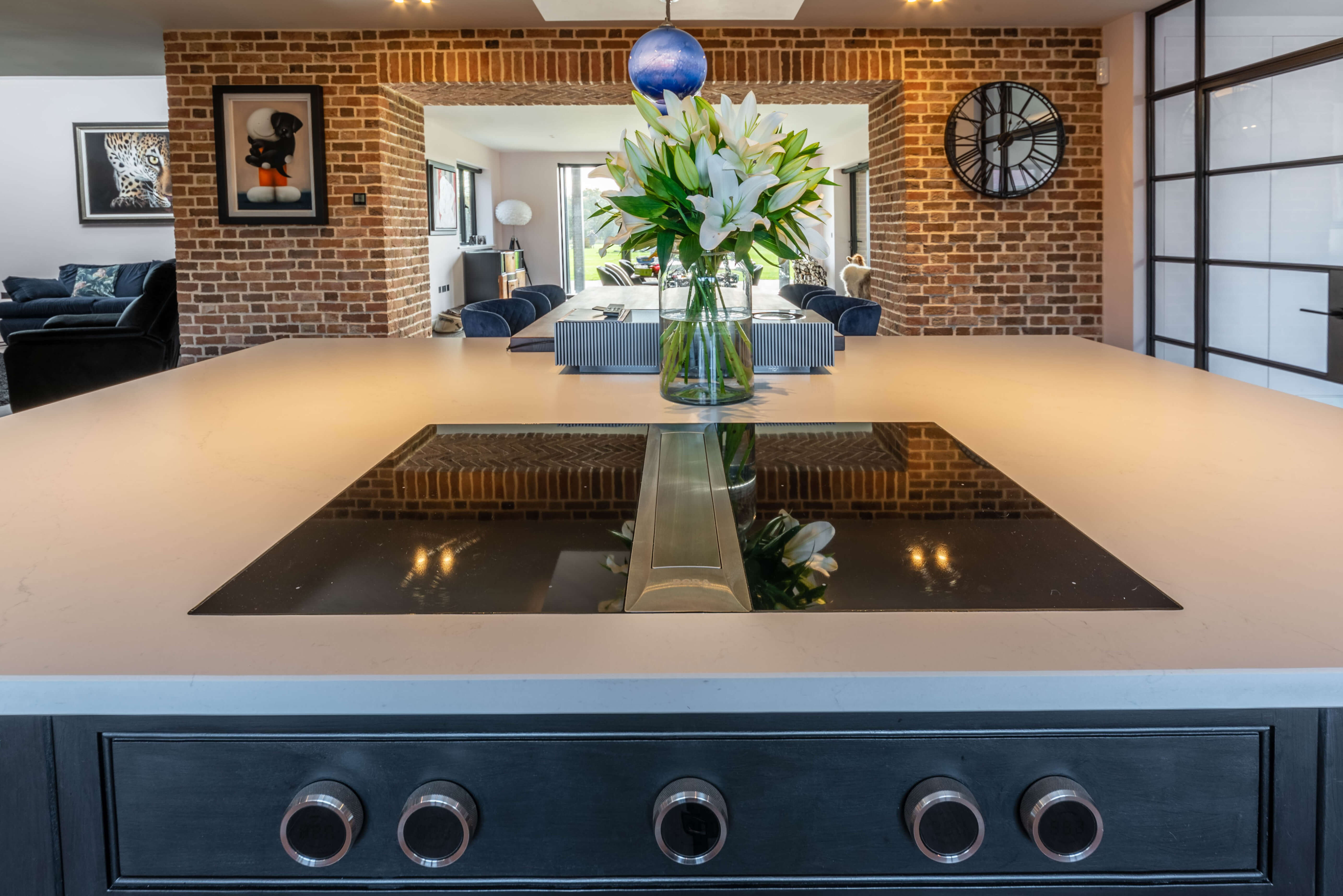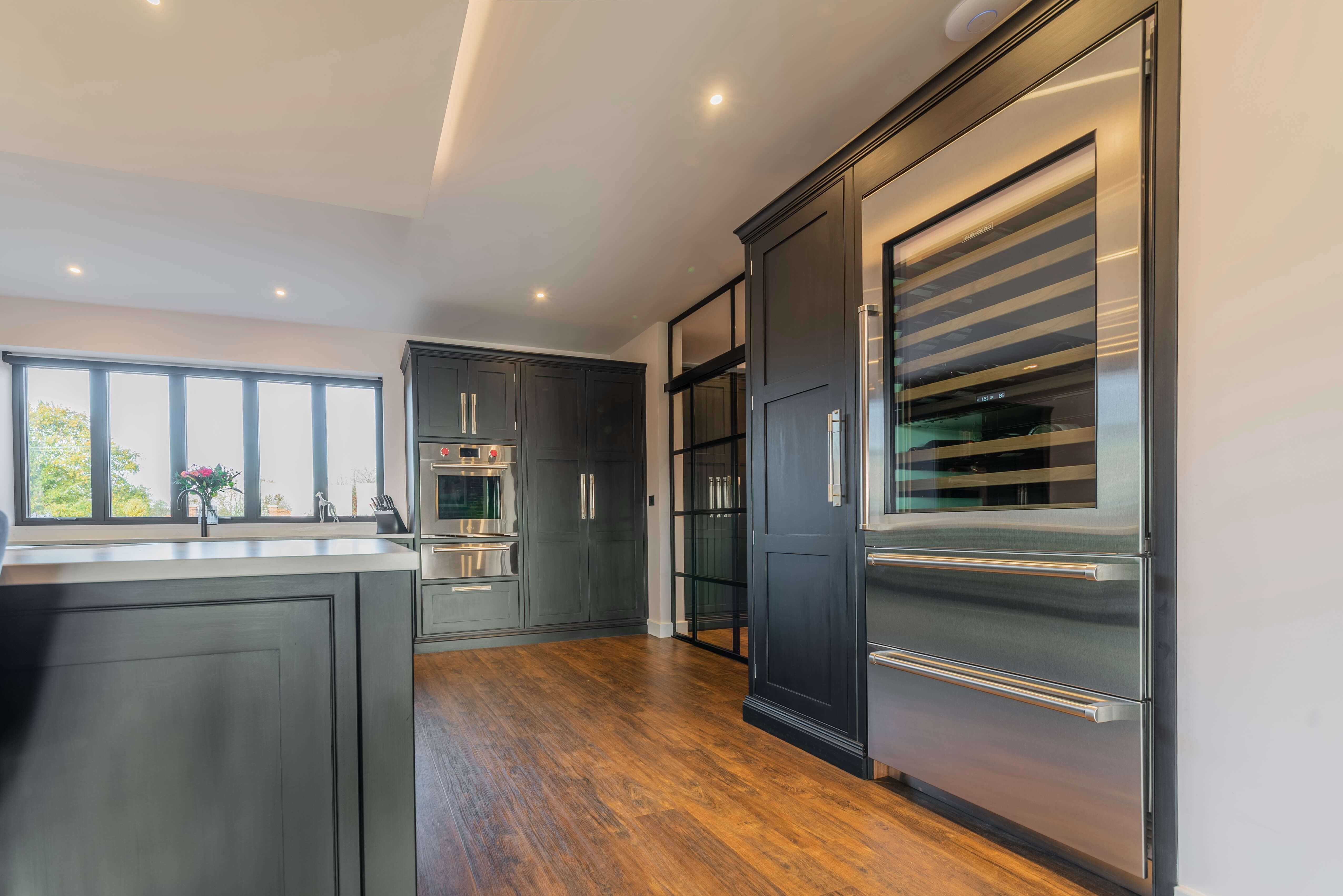 这间宽敞的开放式家庭厨房与众不同;由Mylands手绘的唐宁街,这个令人惊叹的胡桃木贴面设计是由我们切姆斯福德团队设计的Sub Zero & Wolf电器和l带独特早餐吧台的大型厨房岛