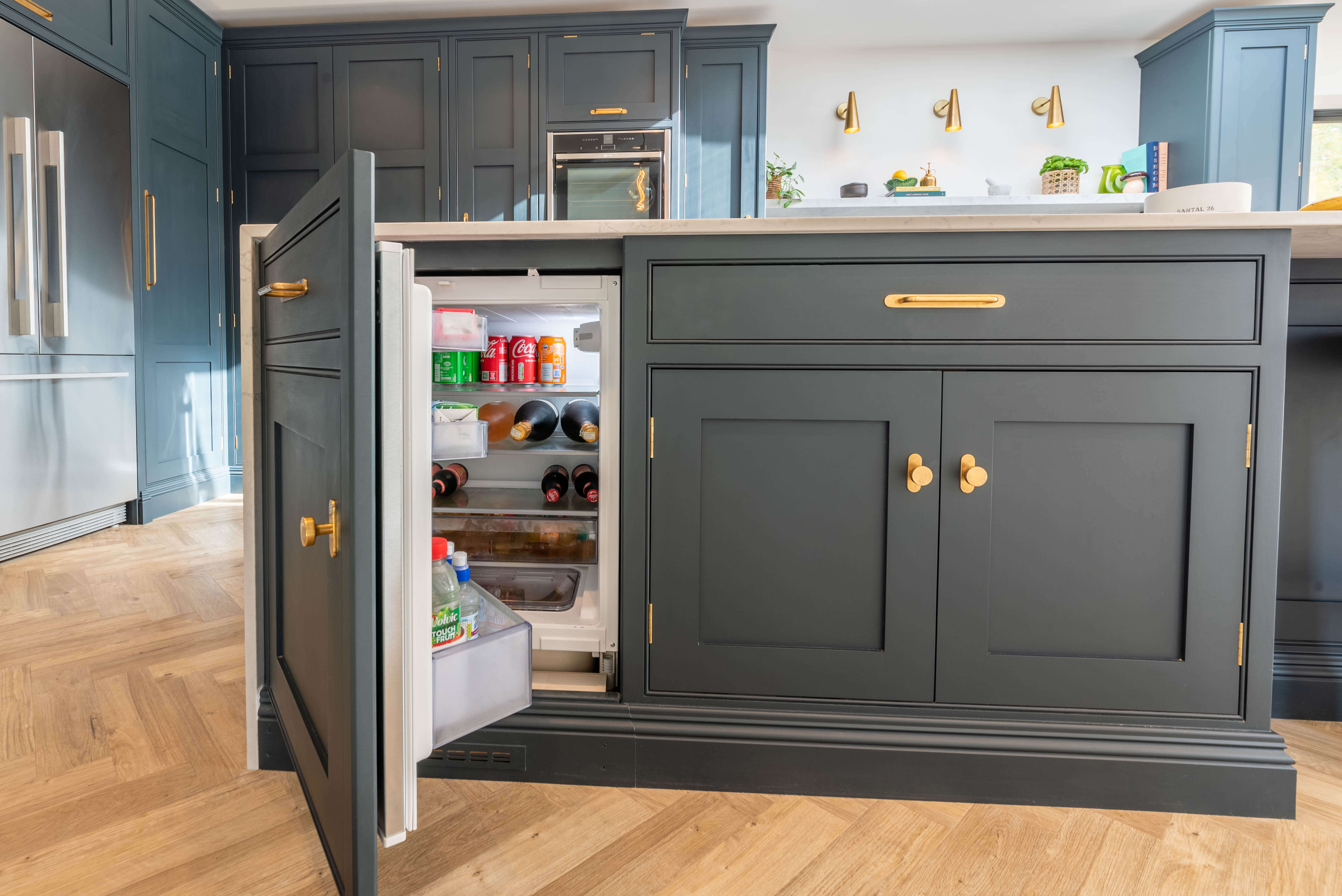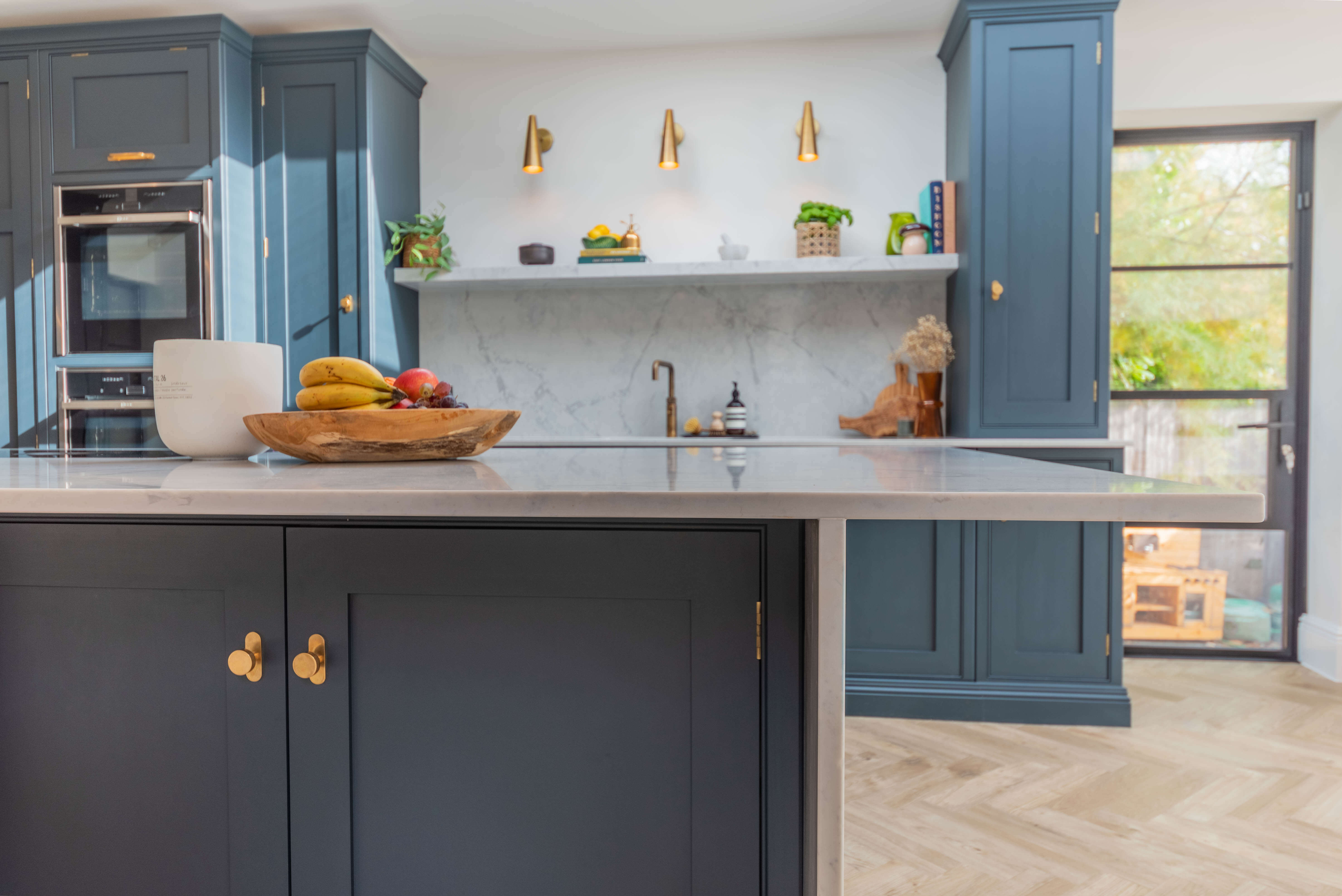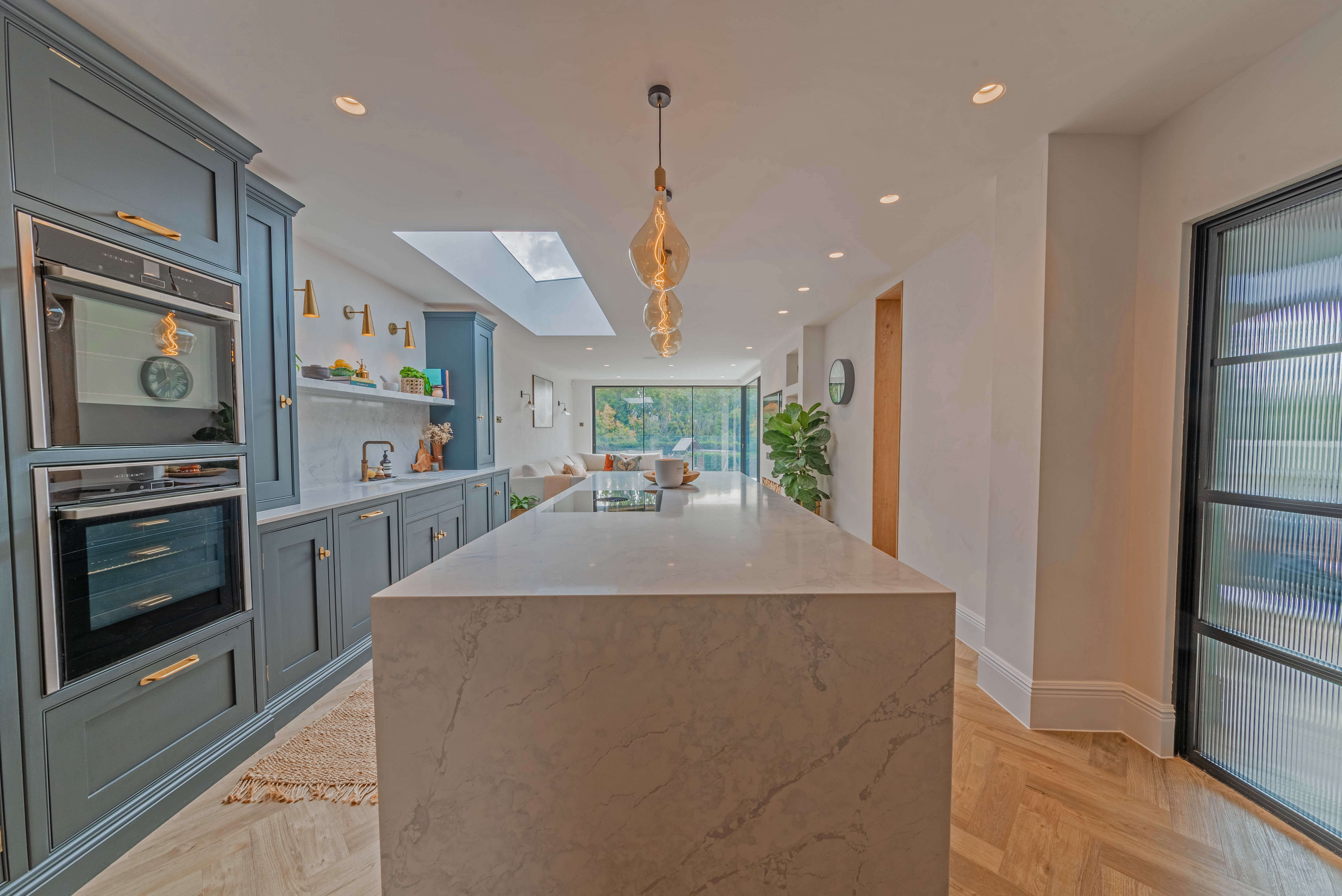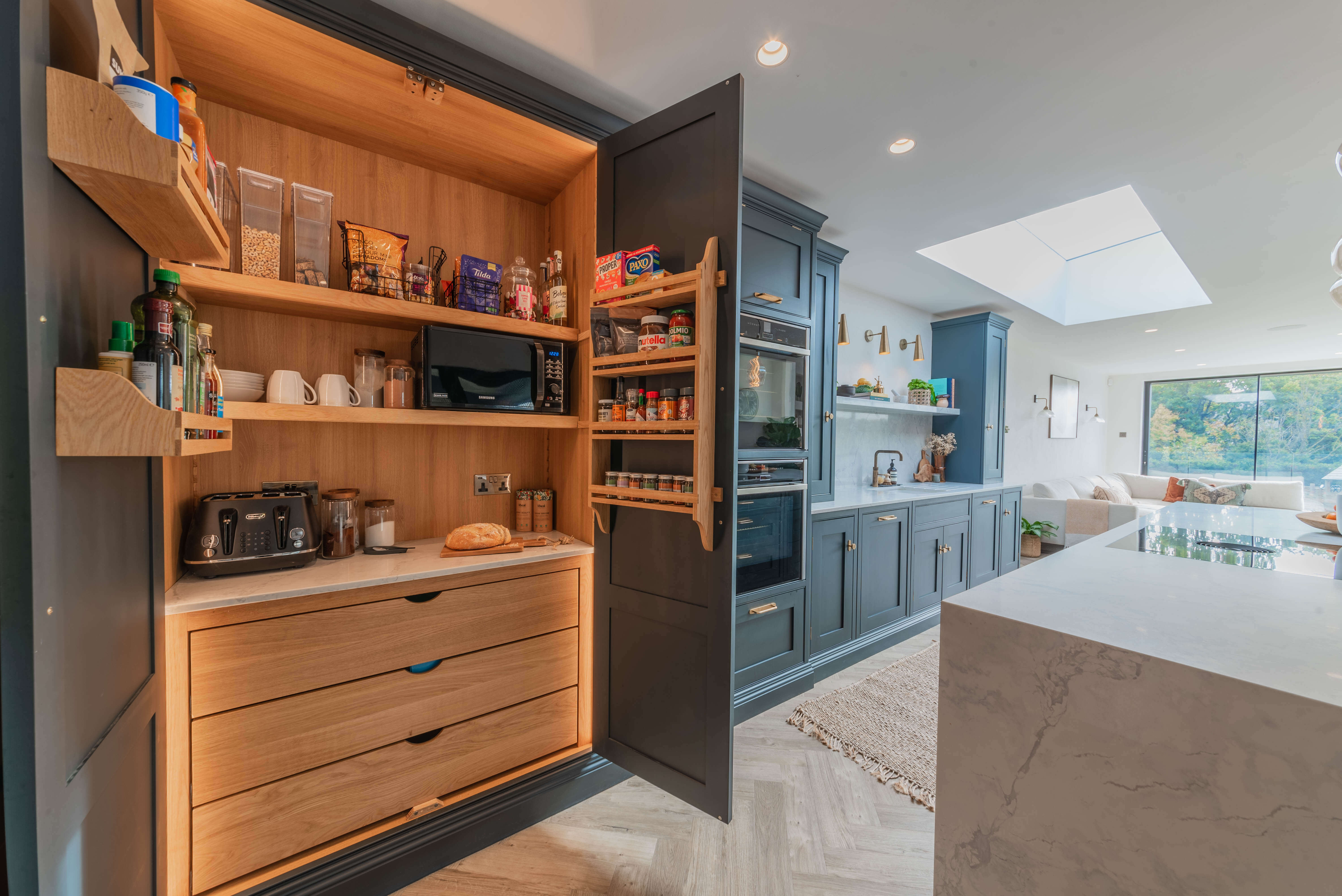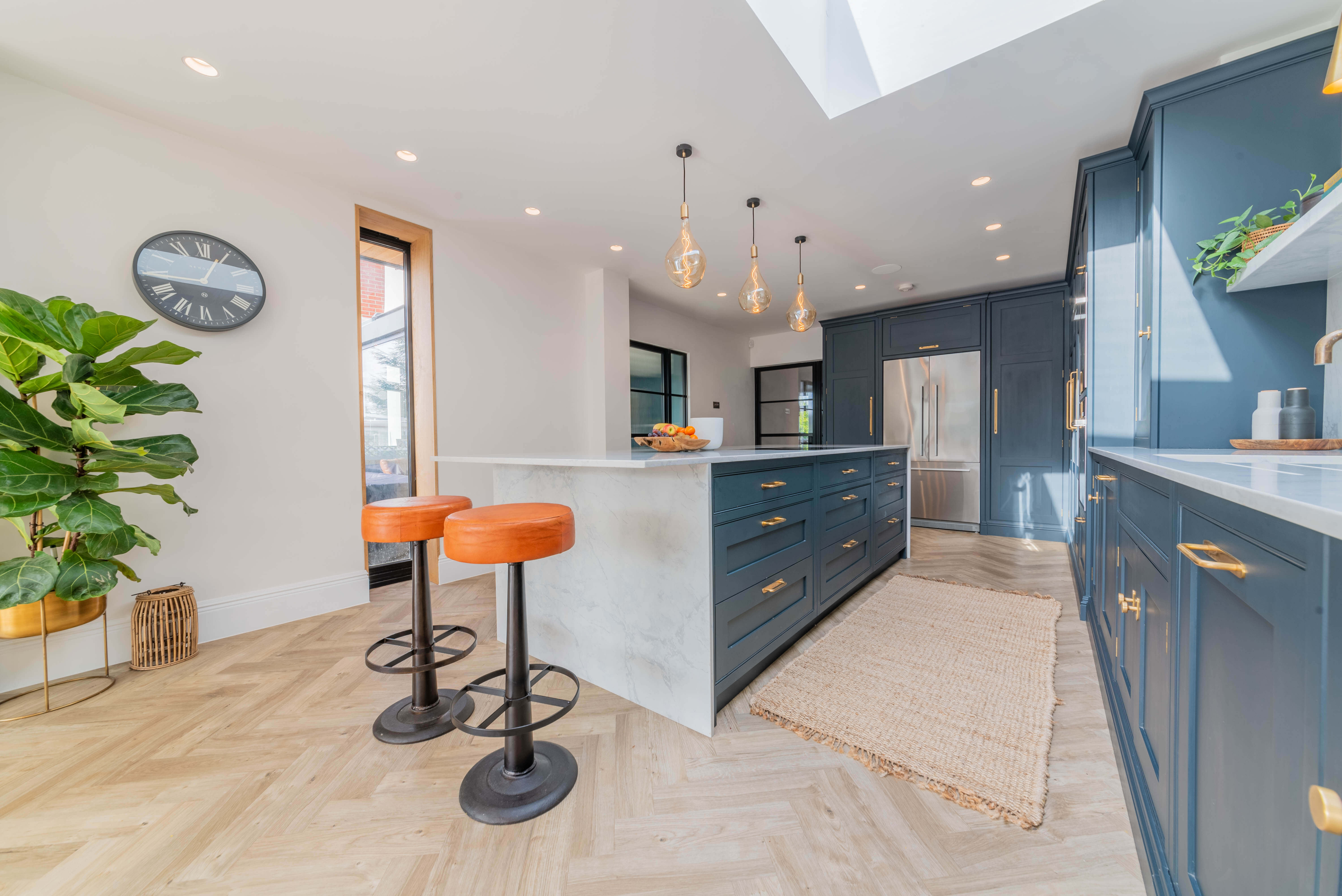我们的Sevenoaks设计团队创造了一个功能实用的家庭厨房,由Farrow & Ball在栏杆上手绘。这个厨房有一个很好的工作三角形和一个瀑布岛,在另一端有一个小早餐吧,在那里家人可以聚集在一起聊天,一起吃饭和做饭。