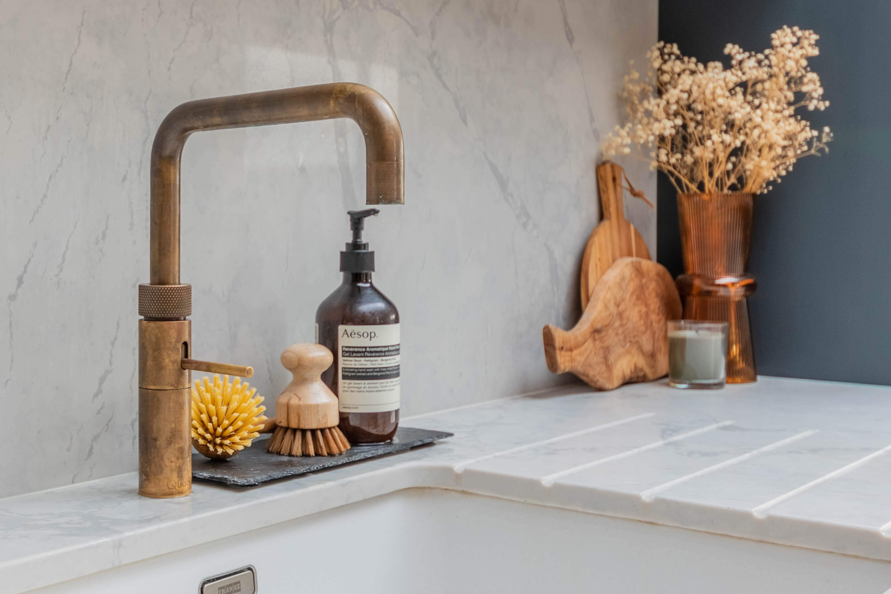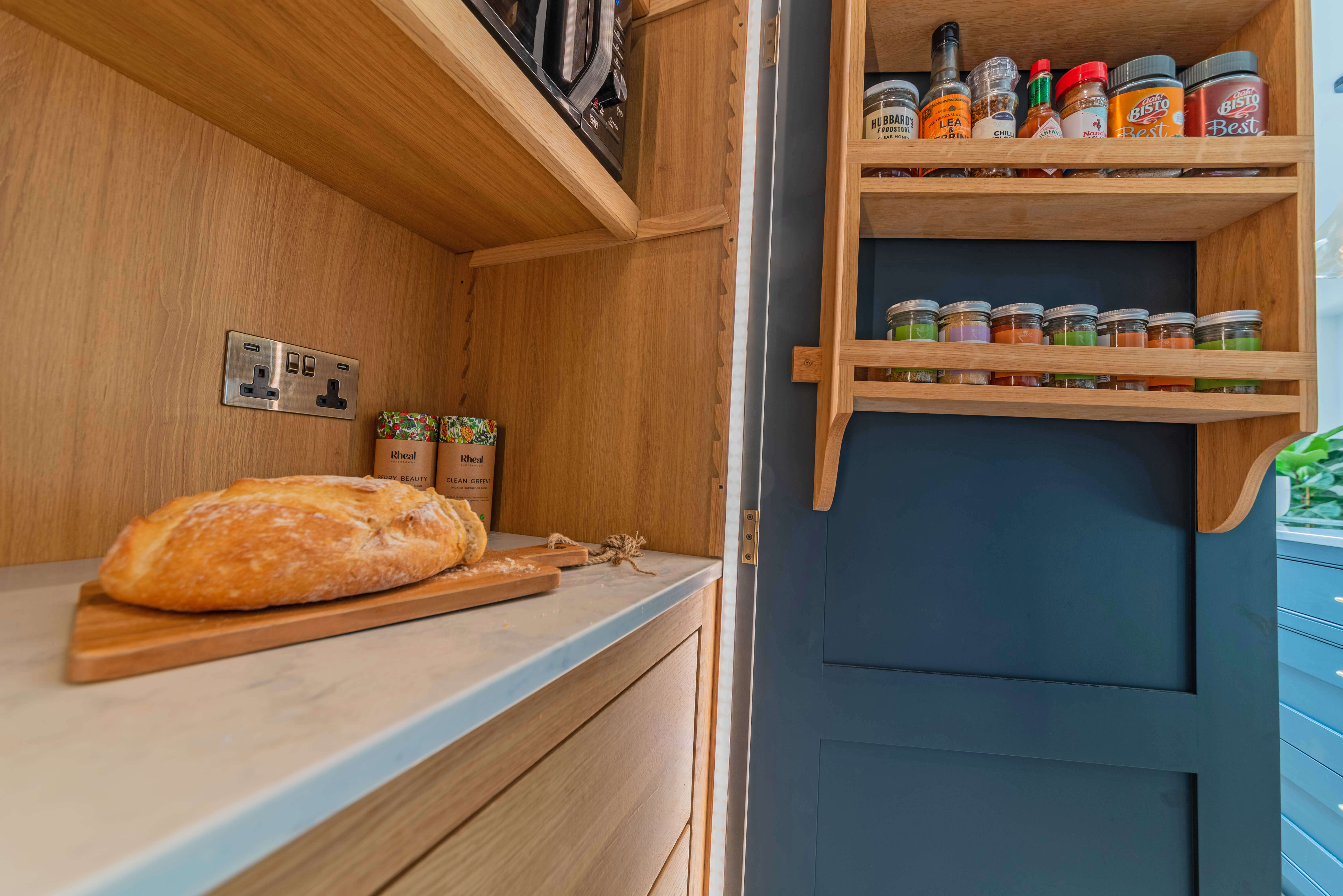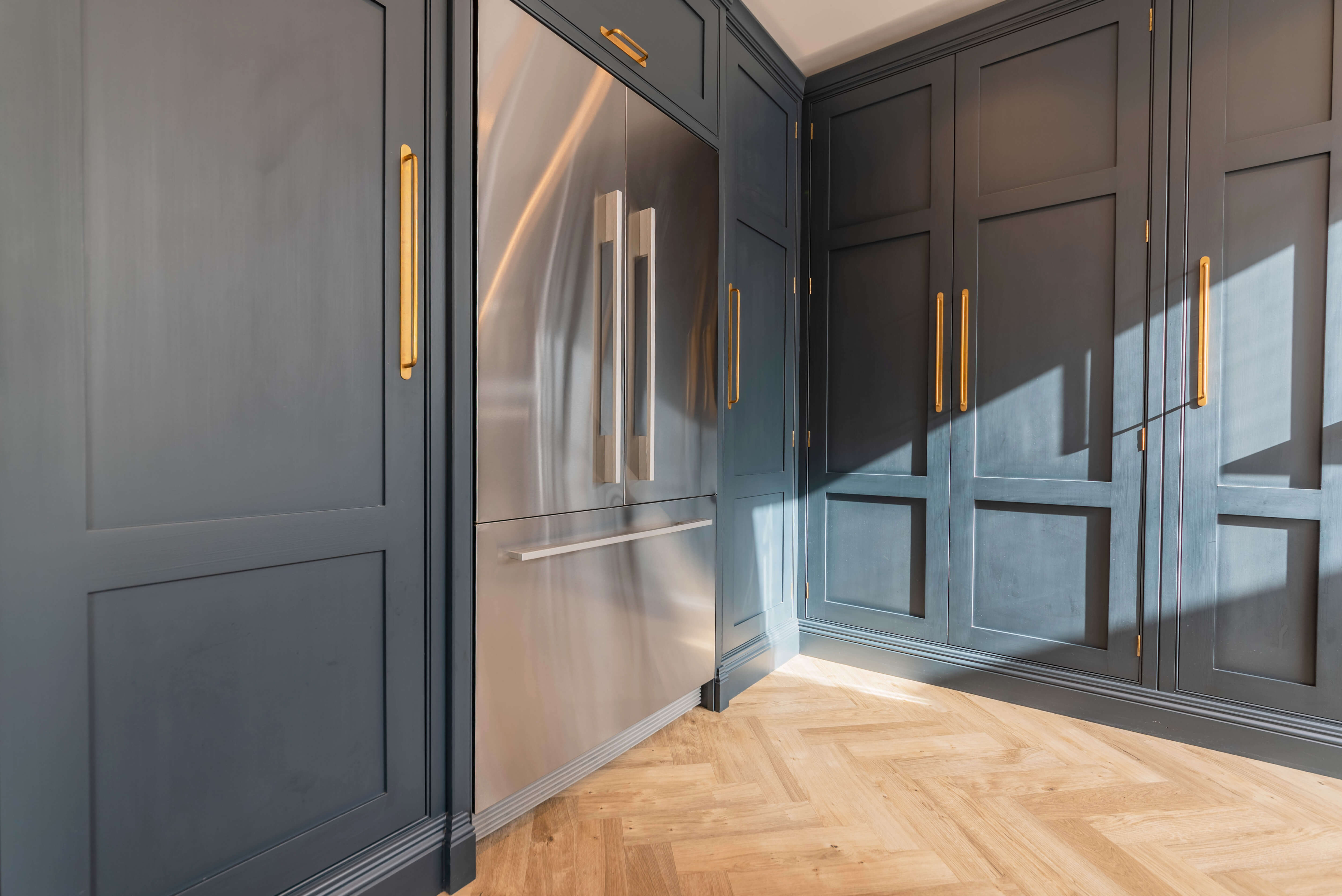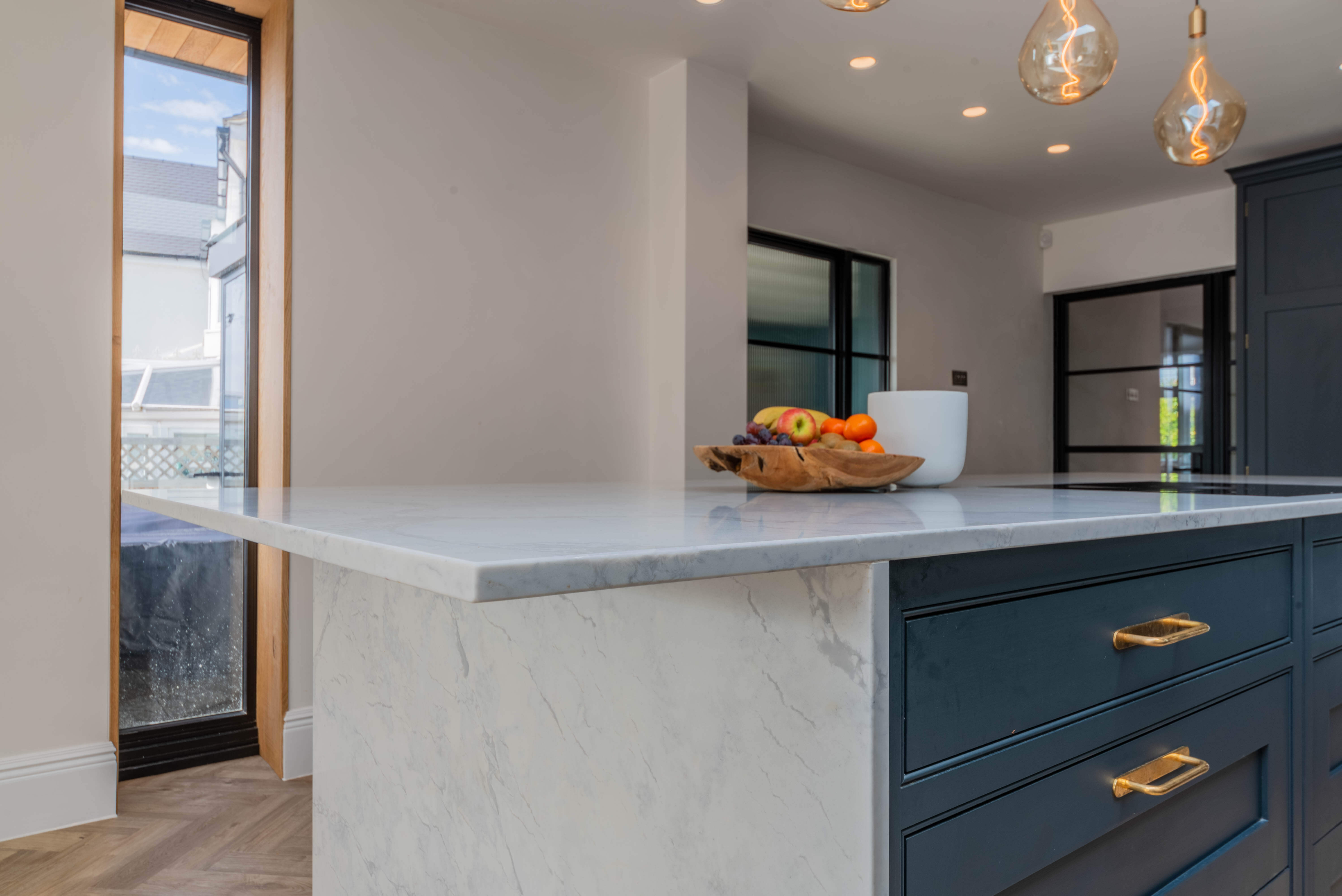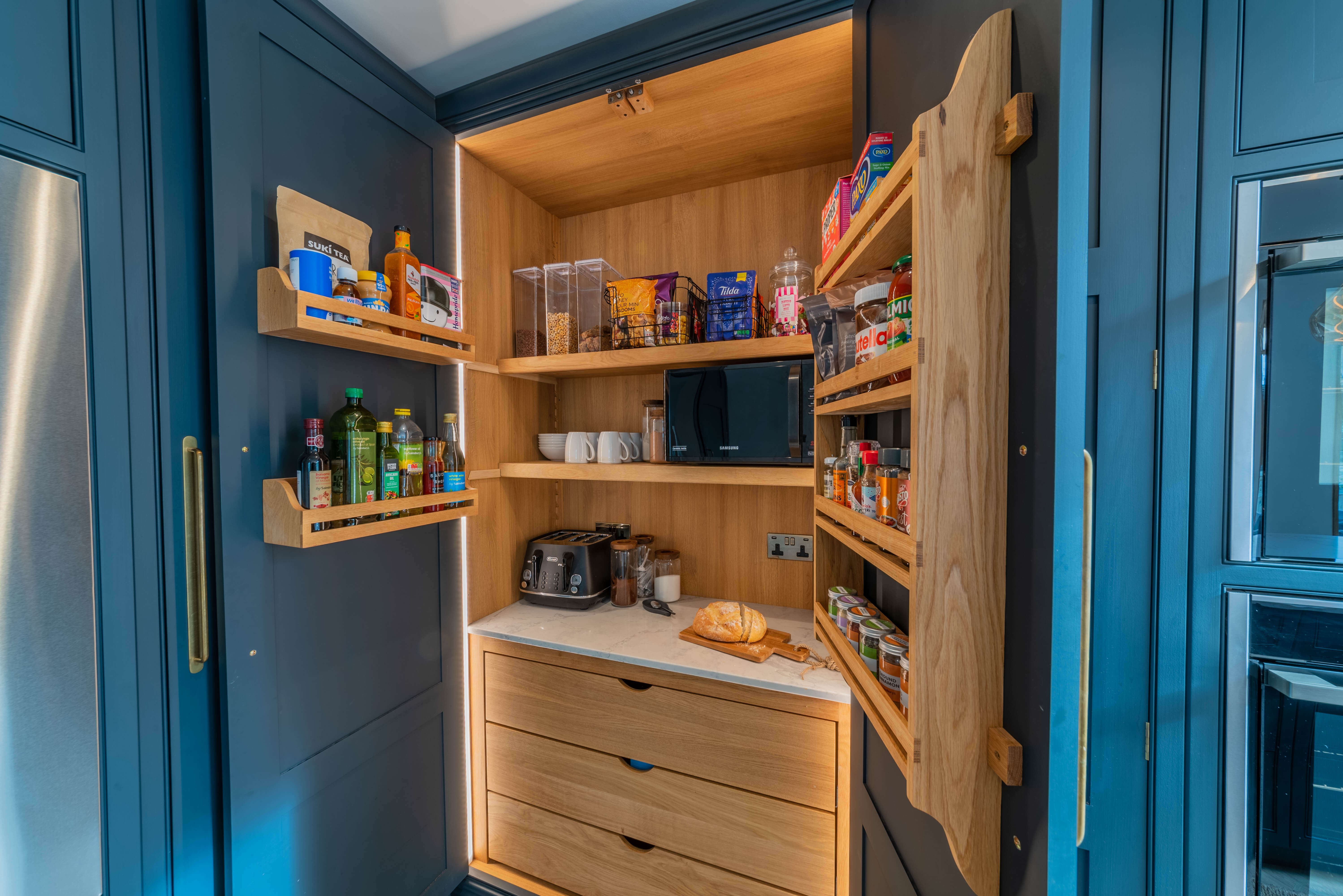 我们的Sevenoaks设计团队创造了一个功能实用的家庭厨房,由Farrow & Ball在栏杆上手绘。这个厨房有一个很好的工作三角形和一个瀑布岛,在另一端有一个小早餐吧,在那里家人可以聚集在一起聊天,一起吃饭和做饭。