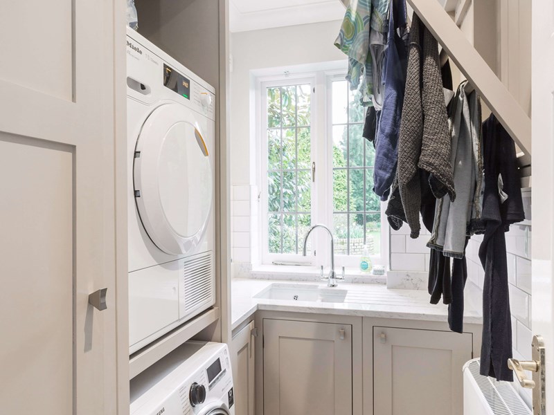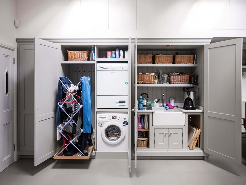 您不必有一个单独的房间来创建一个勤劳的实用程序。厨房内的专用公用区域也同样有用,可以隐藏在储藏室里。